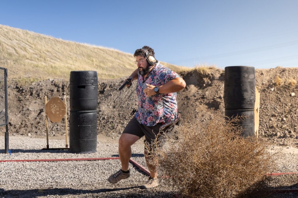 Today was a perfect fall day for a match. We had 138 people over the course of two days. One of the fun bits was Travis created a stage that forced everyone to stay inside the fault lines. They put a tumbleweed blocking the path of anyone trying to leave the shooting area. It was an excellent use of a prop to compel or limit movement.